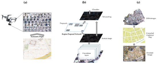 Figure 1 shows the schematic diagram of the method for surveying the asbestos slate roof using drones and Faster R-CNN. As shown the drone image-based automatic identification of asbestos slate roofs consists of three steps: (a) aerial photography, (b) aerial image analysis based on Faster R-CNN, and (c) estimation of the location of asbestos slates. The objective of this study is to automatically detect asbestos slate roofs and estimate their locations. To achieve that, the compiled cadastral map and orthoimages were used, which are public data provided by the government.