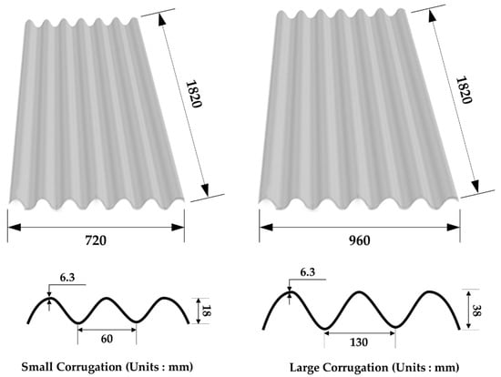 Aerial images are used for two purposes in this study: (1) detection of asbestos slates based on Faster R-CNN, and (2) estimation of the location of asbestos by constructing orthoimages. When taking aerial images from a drone to detect asbestos slates and estimate their locations, it is necessary to consider the altitude at which aerial images are taken, camera angle, time slot of aerial images, photographic method, and photograph overlap. The altitude must be set such that asbestos slate roofs can be distinguished from aerial images. Based on the altitude, the ground sample distance (GSD) value that considers the external characteristics of asbestos slates should be satisfied. As mentioned in Section 1, asbestos slates have distinct external characteristics. As shown in Figure 2 below, the asbestos slate has a 6 cm gap between the grooves. Therefore, it is required to secure a GSD value of at least 3 cm/pixel to enable the identification of the gap between grooves. In addition, if a high-rise structure exists around the target site, the height of that structure must be considered when setting the altitude.