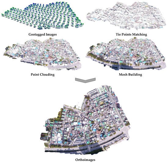 To estimate the location of asbestos slate images taken with a drone, orthoimages must first be created. They require aerial image data, exterior orientation factors, and a precise digital elevation model (DEM) for the target site. The accuracy of orthoimages is determined by the quality of aerial photography images, the accuracy of exterior orientation factors, and the accuracy of DEM [27]. The point cloud-based 3D modeling process consists of three steps: (1) tie point matching, (2) point cloud generation, and (3) mesh building. For the construction of a 3D model, the feature points are extracted from aerial photography images acquired from the unmanned aircraft in the initial processing step through the Scale Invariant Feature Transform (SIFT) algorithm. Then, the extracted feature points go through the following steps: (1) internal orientation, (2) calibration of image subset, and (3) relative orientation. If the value of the bundle adjustment results is invalid after performing the geo-referencing step, the geo-referencing process is repeated. Next, the point cloud data are generated through the dense reconstruction step, and then, the mesh formation process is carried out to construct a 3D model [28,29]. Lastly, to construct orthoimages, textures are created based on original images and mapped to a polygon mesh model. Orthoimages can be constructed by performing this building texture step. The detailed process of constructing orthoimages is shown in the following Figure 3.