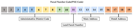 ArcGIS Desktop (by ESRI) was used to estimate the location of asbestos slates detected through Faster R-CNN. ArcGIS Desktop is a basic solution for GIS professionals to create, isolate, manage and share spatial information, it is a program that enables them to create maps, perform spatial analysis, and manage data. The detected object is converted into points by layering the orthoimages and compiled cadastral map, which has Parcel number (PNU) code attributes, in the program. Since each converted point has a PNU code number composed of a unique parcel number, they can be converted into addresses using these numbers. A detailed description of the PNU code is shown in Figure 4.