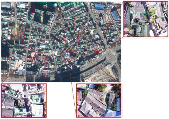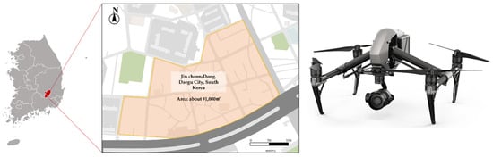 The priority area for removing asbestos slates, where a redevelopment project has been planned, was selected as the target site to acquire the asbestos slate data. The status of the target site is shown in Figure 5 below. Aerial photographs were taken at a vertical angle of 90 degrees around noon on 22 October 2020. The aerial photography altitude was set at 70 m in this study to avoid collisions with high-rise apartments and secure a GSD at which the identification of unique external characteristics of asbestos slates is possible. Both the rotary-wing drone (Inspire 2 model) and vision sensor (Zenmuse X5s) used for aerial photography were manufactured by DJI Co. Ltd. in China. The two systems were connected by a gimbal, as shown in Figure 5. The resolution of the camera was 5280 × 2970 pixels, and the field of view (FOV) was 72° (DJI MFT 15 mm/1.7 ASPH). The GSD of the image acquired through the route flight was analyzed at 1.32 cm/pixel, ensuring a GSD level at which the gap between the grooves of the asbestos slate can be identified. Aerial photographs were taken approximately during 15 min of automatic flight at an average flight speed of 10 m/s. By considering the overlap and image registration for constructing orthoimages, aerial photographs were taken by setting both forward and lateral overlaps at 70%. As a result, a total of 254 aerial images were obtained.