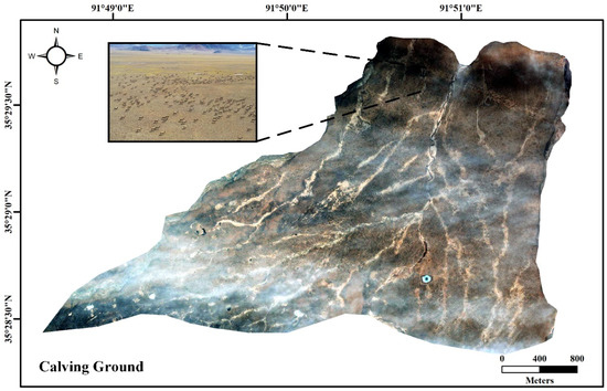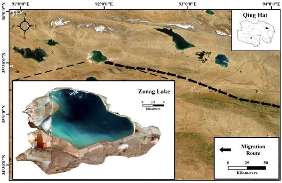 Situated in southwest Qinghai Province, China (top right of Figure 1), the unpopulated areas of Hoh Xil are 83,000 square kilometers with an average altitude of 4800 m. The Zonag Lake and Sun Lake in northwest HXNNR (lower left of Figure 1) have been identified as the current principal calving grounds for Tibetan antelopes. The birth season reaches its peak from mid-June to July every year, when tens of thousands of female Tibetan antelopes from the TRHR (Three-Rivers Headwater Region), the Qiangtang Plateau of Tibet, and Hoh Xil migrate about 300 km southwest to the Zonag Lake and the Sun Lake for parturition [4]. Therefore, the Zonag Lake is also known as the “great delivery room of antelopes”. After calving, the antelope population will return to the northeast and arrive at the major overwintering pastures in mid-August.