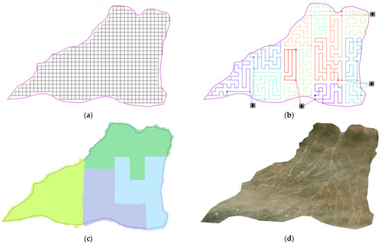 Figure 4. Planning workflow. (a) The coverage grides of survey area; (b) Planned flight path of UAV. The planned UAV path is a solid line, and the transit route is a dotted line. The drone logo represents the take-off and landing location; (c) The resulting photo coverage area allocated to the four UAVs with different starting points in (b); (d) The last stitched image.