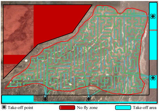Figure 5. Survey routes. All routes to the survey area are shown here. The blue-green lines are routes, which are planned by the method in this paper, and are executed by four UAVs at different starting points. The blue area is the optional takeoff and landing area. The red no fly zone marks the mountainous area or flight interference area.