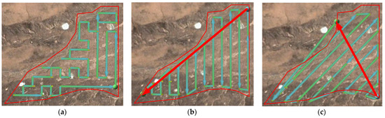 Figure 6. Comparison of route planning methods. (a) Ours; (b) Sweep-style path; (c) Polygon coverage. The red arrow is the flight path of backtracking.