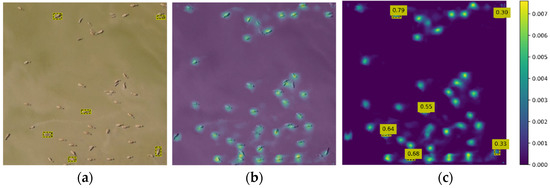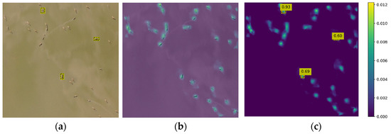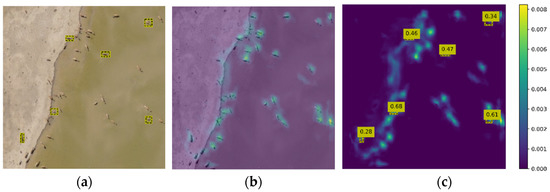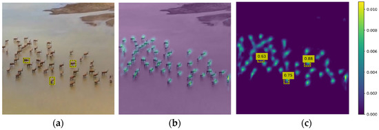 Figure 7. Low-density photos of Tibetan antelope taken by UAVs above. (a) Input image and a few exemplar bounding boxes depicting the object to be counted; (b) Overlapping of the input image and the predicted density map; (c) Predicted density map. The value in the yellow box represents the predicted density value. The ground truth count is 34, the predicted count is 35, and the accuracy is 97.1%.