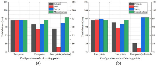 Figure 11. The total flight distance of a group of UAVs. (a) Set the total flight distance as the optimization parameter; (b) Set the weighted sum of total flight path and total mission time as optimization parameters.