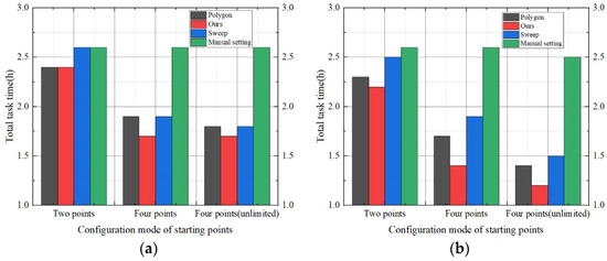 Figure 12. The total mission time of a group of UAVs. (a) Set the total flight distance as the optimization parameter; (b) Set the weighted sum of total flight path and total mission time as optimization parameters.