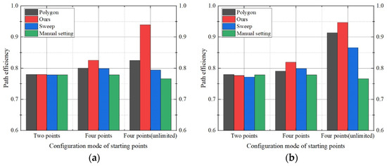 Figure 13. Trajectory efficiency of a group of UAVs. (a) Set the total flight distance as the optimization parameter; (b) Set the weighted sum of total flight path and total mission time as optimization parameters.