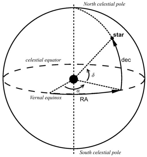 The position of stars and planets in the sky are represented in the International Celestial Reference Frame (ICRF). The location of a celestial body is expressed in terms of right ascension, , and declination, , as seen in Figure 1. Stars are assumed to be infinitely far away, lying on the celestial sphere. Consequently, translational motion has no effect on the apparent position of the stars.