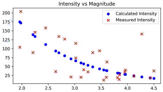 where is a vector containing all calculated star brightnesses, and is a vector containing all measured star brightnesses. The vector is computed for each star in the reference image by choosing and from the reference star, and recomputing for all stars in the image using Equation (37). Stars whose brightness is saturated (i.e., have a maximum pixel value of 255) are excluded from this process. Figure 2 shows the output from this calibration process, conducted on an image captured from a grounded aircraft, using a PiCamHQ with 500 ms exposure interval. We note that this procedure is most effective with a larger number of visible stars, such that the sample better represents the population. In this example, stars were automatically detected and matched to the database using a star identification algorithm. As an alternative to this automated process, one could manually label each star in the reference image.