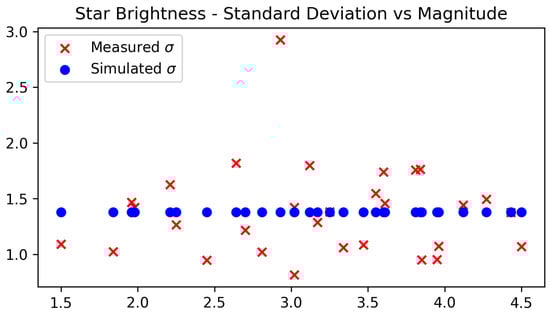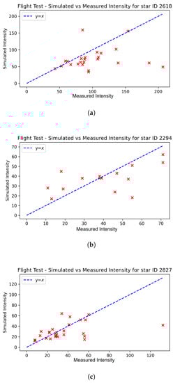 We evaluate the performance of the simulator based on its ability to replicate in-flight star intensities, given a ground calibration image. Figure 8 shows individual stars which were identified across multiple images in-flight. The intensity of the simulated star was plotted against the intensity of the observed star, such that points lying on the line represent a perfect match between reality and simulation. Three stars are shown here; these stars were identified frequently in both reality and simulation. We can see that, in practice, there tends to be error in the pixel intensity. The mean error is near-zero with a value of 3.38 pixels. The mean absolute percentage error in pixel intensity is measured at 47.4% (this is an average of per-star absolute percentage errors), which is similar to the mean absolute percentage error of 51% in the brightness ground calibration, as expected. Using Equation (36), a 47.4% error in star magnitude correlates to an absolute magnitude error of 0.42. This is within comparable range to the noise level simulated in other works, such as [,], which artificially add magnitude noise with standard deviation in the range of 0.3–0.9 to their simulation.