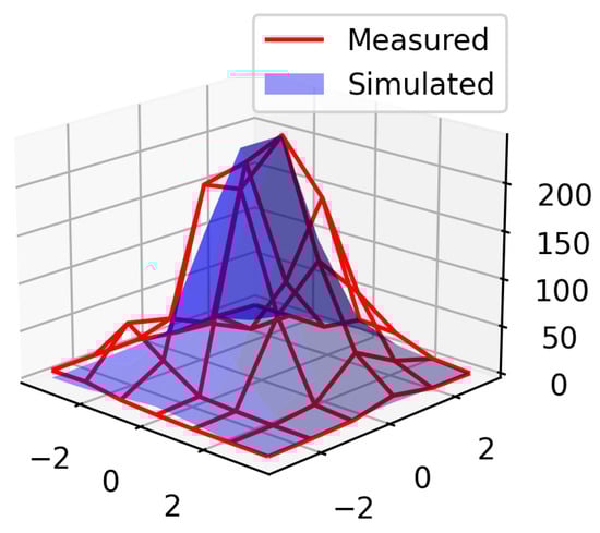 Pixel intensity of a measured star (red wireframe), with the simulated pixel intensity overlaid (blue solid).