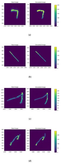Close-up of bright stars captured in motion. Real images (left) are paired with their simulated counterpart (right). (a) Image captured during aerial manoeuvre; (b) Image captured during constant-rate turn; (c) Image captured with high pitch-rate; (d) Image captured during aerial manoeuvre.