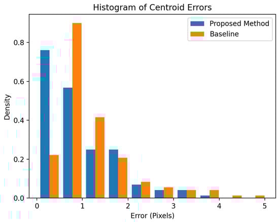 for simulation centroid and real centroid . A histogram containing the computed centroid errors can be seen in Figure 9. For reference, we also compute a baseline estimate, which assumes the centroid is located at the centre of the ROI (analagous to simulating stars as a straight line with uniform intensity). The mean simulation error is measured to be 0.92 pixels, with a median error of 0.68 pixels. By comparison, the mean baseline error is measured at 1.23 pixels, with a median error of 0.93 pixels. This corresponds to a 25.2% reduction in mean centroid error.