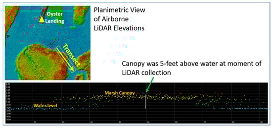 The airborne LiDAR data were collected in the late winter in early 2017 at expected low tidal levels. The coordinate system was the South Carolina State Plane International feet in the NAD83 (2011) horizontal datum and NAVD88 vertical datum. The ellipsoidal heights were transformed to NAVD88 heights with the GEOID12B model. The accuracy assessment conducted by the aeroservice contractor for the non-vegetated areas reported a 0.061 m root mean squared error (RMSE). The aggregated nominal point density (ANPD) was 5.26 points per m2. To resolve local and NAVD88 tidal height, we used the same airborne LiDAR returns over the water surface to estimate the tidal height at LiDAR collection. It is well-known that LiDAR pulses operating in the short infrared wavelengths are effectively absorbed by water, making it problematic for mapping water bodies or surfaces covered by water. However, water surfaces with wave activity, however small, typically result in some low-intensity LiDAR returns. Some returns were detected by the airborne LiDAR sensor (e.g., Figure 3) and were used to estimate local tidal height in the NAVD88 datum. The tidal elevation at Oyster landing during LiDAR collection was determined to be −0.55 m NAVD88. Mean low water (MLW) and mean high water (MHW) at Oyster Landing are −0.680 m and +0.625 m, respectively. Thus, the LiDAR collection was very near the mean low water (actually 13 cm higher than MLW). For our analysis, we assume the water elevation surface was MLW.