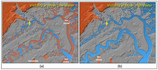 (a) Modeled visible/invisible areas of the Winyah Bay wetland environment for an aerial drone at 1 m above water level at mean low water (MLW). (b) Modeled visible/invisible areas for an aerial drone at 1 m above water level at mean high water (MHW). The sUAS in any of the orange-colored areas would be invisible to the operator at the Oyster Landing location.