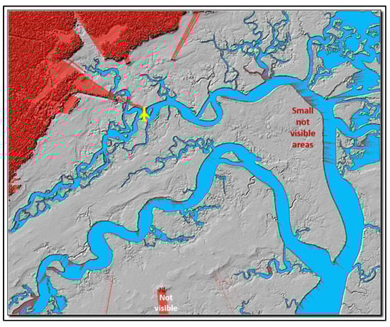 Modeled visible/invisible areas of the Winyah Bay wetland environment for an aerial drone at 1.5 m above water level at mean low water (MLW). The sUAS in any of the orange-colored areas would be invisible to the operator at the Oyster Landing location.