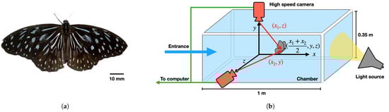 Experimental setup. (a) Photograph of a blue tiger butterfly (T. septentrionis). (b) Measurement method. Two synchronised high-speed cameras were mounted onto a transparent chamber orthogonally along the y- and z-axis. By utilising the photographed images, a butterfly’s position could be determined.