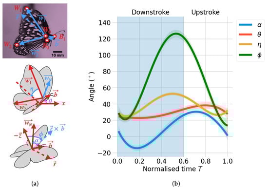 Angle parameters of a flying butterfly. (a) Definitions of angles. From the coordinates of each feature’s points, body pitching angle , sweeping angle , rotation angle and flapping angle were obtained. (b) Angles measured from the experiments (). The solid lines indicate four feature angles; the surrounding shaded areas represent the 95% confidence intervals. The abscissa axis denotes the normalised time in a flapping period; the blue area (from to 0.6) indicates the downstroke phase, and the rest (from to 1) is upstroke.