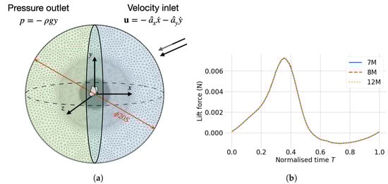 To deduce the aerodynamic interactions that were hard to observe directly, we chose CFD simulation to generate highly accurate datasets. The obtained morphological parameters and kinematic equations were further utilised to build a butterfly model and regenerate the flight behaviour through a commercial solver (Fluent, Ansys, Canonsburg, PA, USA). The SIMPLEC algorithm was applied to resolve pressure and velocity fields [29]. To reduce the computational cost, we simulated the flow field under a relative condition frame. Therefore, the butterfly was flying at the centre of a sphere (see Figure 3a). The butterfly would thus encounter an incoming airflow with a virtual acceleration a created by its flight. To avoid inaccurate outcomes affected by the wall effect, the diameter of the spherical flow domain was set to (around 900 mm). As the Reynolds number of a natural flying butterfly is around –[30], the medium was considered an incompressible Newtonian laminar airflow, with a density of kg/m and viscosity of Pa·s. Furthermore, we utilised the following governing equations for computation: