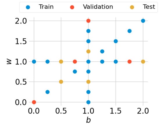 Generated datasets. The data were randomly separated into training (64%, blue markers, ), validation (16%, red markers, ) and testing (20%, amber markers, ) groups. The testing data were merely utilised for evaluation and did not participate in the training processes.