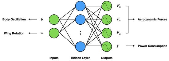 With the advances in computer hardware, machine learning shows another approach for modelling. Unlike conventional computation, related mechanisms are not required (e.g., governing equations). Recently, some studies have shown that machine learning methods can be implemented in aerospace science, including flight pattern recognition [20] and aeroelastic estimation [21]. In the study of flapping mechanics, some researchers have tried to adopt this new technique into control systems [22,23,24]. Nevertheless, the application for flapping flight aerodynamic analysis has not yet been fully developed. Two studies [25,26] utilised this method to predict the net forces produced in a single flapping cycle, but the transient analysis has not been completed yet. Therefore, researchers still relied on conventional approaches to obtain details, such as the changes during upstroke and downstroke, to explain the impacts of different flight modes.