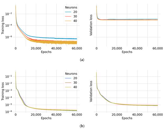 Figure 7 depicts the mean convergent curves of each case during the training process. From the testing result, we found that though the training loss of ReLU model kept decreasing when epoch size was greater than 10,000, the validation loss of it remained around . We further found that as the number of hidden units was 40, which had the smallest loss, its validation loss was and when epoch sizes reached 30,000 and 60,000. As the difference between these two values was less than 3%, we considered the 40 hidden neurons and 30,000 epochs to be an adequate setup. On the other hand, the training and validation loss of sigmoid model plots reveal that a larger number of hidden neurons did not promise a smaller loss. When the number of hidden units was 30, the validation loss difference between epochs 50,000 and 60,000 was less than 3% (epoch 50,000: , epoch 60,000: ). Consequently, we considered the number of hidden units and epochs to be 30 and 50,000, respectively.