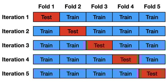 It was unsure if the accuracy of the ReLU activation function was sufficient to predict the four aerodynamic properties, though the validation loss of the sigmoid-based model was even lower. We hence utilised both models for the following analysis. To avoid overfitting, the unused 20% of the data were assigned as testing datasets. As all the data generated by the CFD simulation were from the same system, the model that fits one group should fit the other as well. Because these cases were not utilised for previous training, they were considered to be unseen data for the following model evaluation. If the number of datasets is sufficient, we can utilise a large number of cases to evaluate our models. However, it is not easy to collect hundreds of results as it generally takes about 4 to 7 days to complete a single simulation. To deal with a limited amount of data, k-fold cross validation was implemented for obtaining a reliable evaluation [46]. To implement this method, the database needs to be randomly split into k groups first so that we can evaluate a model k times. In each iteration, we only utilise groups to train our network. As there is one group that does not join the training process, it can be utilised for testing. Therefore, this can be utilised to protect our models from overfitting as the model will be examined by k different combinations. To keep 20% of the entire data for testing, we chose k to be 5 in this study (see Figure 8).