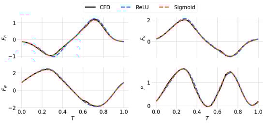 As it is difficult to understand the difference between the two models by just viewing the values, we picked up a case from the testing group, which had a maximum value difference of 0.005, for comparison. Figure 9 presents the output aerodynamic properties as the b and w were assigned to 1 and 0, respectively. By comparing these curves, we can find that the red dashed line (sigmoid) almost overlaps with the black solid line (CFD simulation). On the other hand, the blue dashed line (ReLU) is slightly off in the peaks. By way of illustration, the blue dashed line shifted marginally to the right at in the -T plot. Nevertheless, the trends of four aerodynamic properties can still be identified.