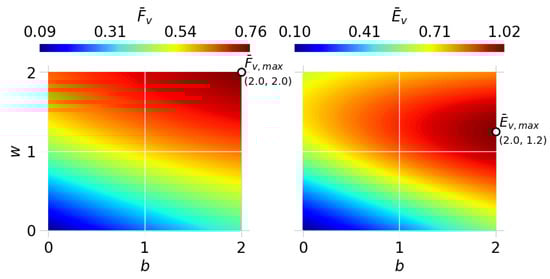 where and are the mean values of and P in a single flapping period, respectively. We could hence obtain a quick result by utilising the ANN method. Figure 10 depicts the corresponding and when b and w are in the interval of [0, 2]. Because the two models presented similar outcomes, we only display the sigmoid-based calculation in Figure 10. The result illustrates that the maximum appears at . Nevertheless, the lift efficiency can still be improved by reducing w to 1.2. To verify if it fits the actual circumstance, we ran the simulation and compared the results (see Figure 11). The MSEs of and P were and , respectively. Considering the high and low MSE values, we believe this neural network approach can provide precise estimations which can be utilised for studying the flapping wing system.