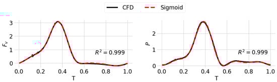As the outputs of our models were coefficients of the four aerodynamic parameters, we converted the signal back by utilising Equation (8). The prediction can hence be compared with the original curves by calculating the coefficients of determination . The mean and standard deviation (SD) of the two models are given in Table 2. We first checked if the overtraining occurred on our model. Since the training and testing values are all close to 1, the models encountered neither underfitting nor overfitting problems. Although the MSE loss of the sigmoid-based model was smaller than the other one, as they both have mean values greater than 0.99, the differences were not obvious. However, the SD values of the ReLU-based model were slightly higher. The result implies that the sigmoid activation function generally provided higher precise estimations.