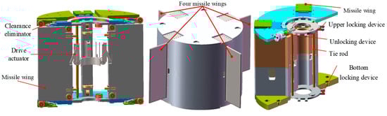 In order to achieve a large stowage ratio, fast actuation, and high stiffness retention, we propose a new deployment mechanism with clearance eliminator for missile wings. The designed deployment mechanism mainly consists of the drive actuator and the clearance eliminator, as shown in Figure 1. The principle of wing ejection and locking is shown in Figure 2. The operating principle of the deployment mechanism includes three steps: 1. With the command of the unlocking issued, the upper and bottom locking devices realize the unlocking action of the wing through the compression springs. 2. Driven by the torsion spring, the crank slider mechanism of the drive actuator pushes out the wing along a straight line. 3. With the wing fully extended, the clearance eliminator eliminates the clearance of the kinematic pair to improve the wing stiffness.