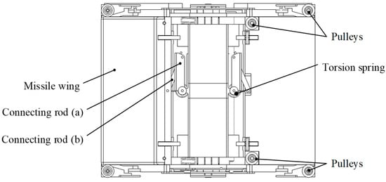 The drive actuator consists of a drive element, linkage mechanism, missile wings, and pulley block, as shown in Figure 3. The torsion spring, as the drive source, is mounted on the input shaft to save design space. One arm of force is supported on the base, and the other arm of force acts on linkage and pushes the missile wing out by linkage b. The ejection assembly of the deployment mechanism is based on the slider-crank principle, as shown in Figure 4. When the wing is pushed out, it is subjected to lateral load, resulting in friction resistance that affects the pushing out of the wing. In order to change the sliding friction between the wing and the base into rolling friction, an axial pulley and a lateral pulley are embedded in the root of the wing, and a pair of ball bearings with flanges are installed inside the pulley to enhance the smoothness and stability of the movement and to limit the pulley axially at the same time.