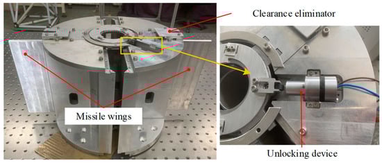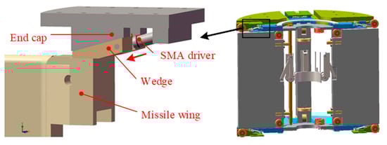 There are clearances between the kinematic pairs of the wing and the missile body to enable the smooth ejection of the wing. In order to improve the dynamic stiffness and stability of the wing, measures should be taken to eliminate the clearance of the kinematic pair. A Clearance eliminator with SMA is proposed to drive a wedge to eliminate the clearance of the kinematic pair between the wing and the base, to generate a locking force to improve the support stiffness of the wing and the base joint, and to improve the resonance frequency and stability of the wing.