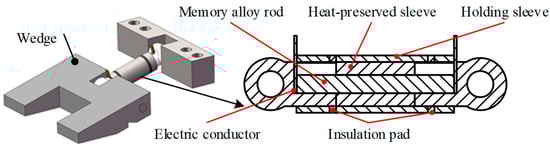 The configuration of the clearance eliminator is shown in Figure 5. The end cap and the base are solidly connected to the missile body, and the shape memory alloy driver is hinged to the base at one end and the wedge at the other end. In order to speed up the deformation response of the shape memory alloy material, the memory alloy rod is heated by directly energizing it. The design of the SMA drive requires consideration of insulation and thermal insulation. As shown in Figure 6, conductive sheets are embedded in both ends of the memory alloy rod and heated by electricity. Heat-preserved sleeve made of insulating material is set on the outside of the memory alloy rod to play the role of insulation and heat preservation. A holding sleeve made of alloy steel is set on the outside of the heat-preserved sleeve to enhance the axial stiffness of the alloy rod and prevent destabilization under pressure. The working principle of the clearance eliminator is shown in Figure 7. The wedge is driven by the shape memory alloy to contact the base and the missile wing and generate mutual force. A positive pressure Fy on the contact surface of the wedge and the wing produces an axial locking effect on the wing, and a frictional force Fx on the contact surface of the wedge and the wing produces a lateral locking effect on the wing. By applying the locking force to the wing, the support stiffness of the root of the wing is improved and the stability of the wing is enhanced.
