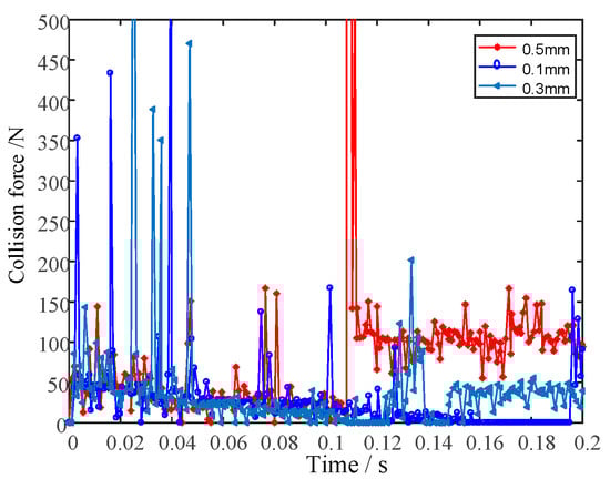 The stiffness coefficient was taken as 1.2 105 N/m, the damping coefficient was taken as 120 N·s/m, and the static and dynamic friction coefficients were set as 0.3 and 0.25, respectively. The simulations were carried out with the clearance of 0.1 mm, 0.3 mm, and 0.5 mm, respectively. The variation in the contact force in the driving joint and the wing joint with time is shown in Figure 9 and Figure 10. The displacement and velocity of the wing with time are shown in Figure 11 and Figure 12.