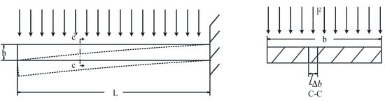 Since the wing is subjected to a uniform load perpendicular to the wing surface as shown in Figure 14, only the transverse bending of the wing is considered, and a unit of arbitrary width in the face is selected for analysis, which can be equated to a cantilever beam with length , width , and height . The equivalent distributed load on it is .