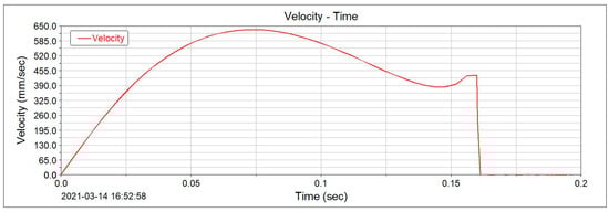 The state of motion during the deployment of the wing is analyzed. The rolling friction coefficient between the wing and the contact surface during the motion of the wing is set to 0.05. The frictional reaction force generated by the air load during the deployment of the wing is equated by attaching a spring to the wing, and the driving torque is set to 1 Nm. The displacement versus time and velocity versus time during the deployment of the wing are shown in Figure 21 and Figure 22, respectively.