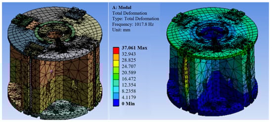 In the unlocked state, Figure 23 shows the boundary conditions and mesh division according to the loading environment. For convenience, we use free mixed mesh generation in the study. The modal analysis is carried out in the unpreloaded state. The results of the fundamental frequency and the first six orders of frequency are shown in Table 1.