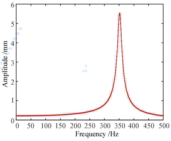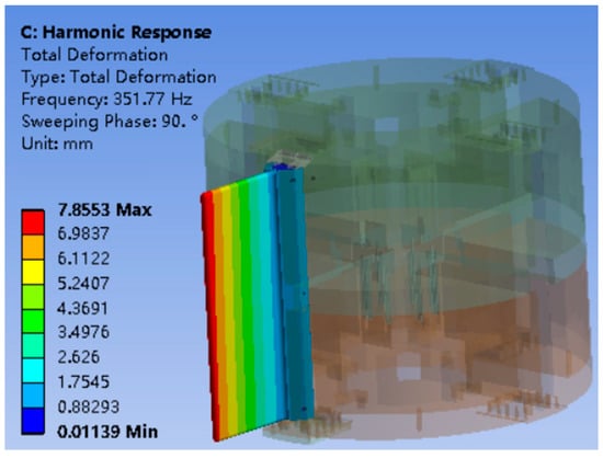 Based on the existing pre-stress modal analysis results, the harmonic response analysis of the missile wing was carried out with the frequency band set to 0~500 Hz and the damping coefficient set to 0.05. In addition, a 700 N uniform normal load was applied on the surface of the wing, and the amplitude versus frequency response was obtained as shown in Figure 25. At resonance, the swept frequency phase angle is set to 90°, as shown in Figure 26, and the maximum deformation of the missile wing is 7.855 mm.