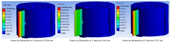 The results of the modal analysis are used as the initial conditions of the random vibration analysis, and the power spectral density excitation in the xyz direction is set as shown in Figure 27. The displacement response of the device as a whole is obtained, as shown in Figure 28. The maximum deformation of the end of the wing is 0.273 mm, which means that it will not cause structural instability or damage under the large power spectral density excitation.