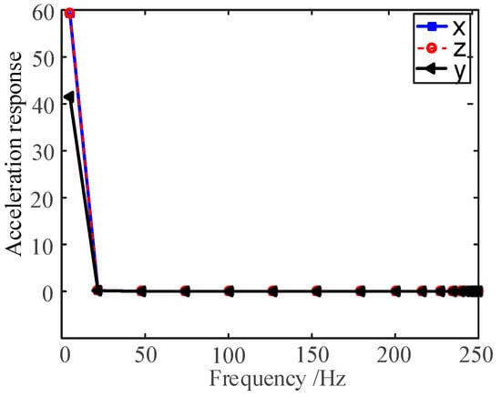 In order to verify the connection stiffness of the wing deployment mechanism along the x-direction and z-direction, the acceleration response spectrum of a point at the end of the wing is selected, as shown in Figure 29, in which the x-direction’s and z-direction’s input power spectrum densities are the same. The results show that the acceleration responses almost completely overlap, indicating that the transverse connection stiffness of the device is high and the stability is excellent.