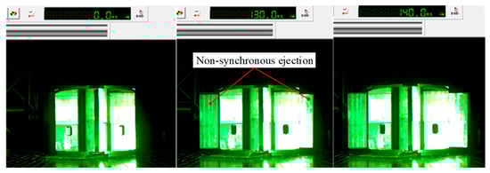 The developed principle prototype is shown in Figure 30. To save costs and improve the test efficiency, only one set of opposing wings was deployed. In order to reduce the weight of the mechanism, except for the key stressed parts which are machined by 40Cr material, the rest of the parts are made of aluminum alloy, and the overall mass of the prototype is about 15 Kg. A high-speed camera is used to record the deployment time of the principle prototype wing, as shown in Figure 31. The deployment process is shown in Figure 32. The complete deployment time of the missile wing is about 0.14 s, which meets the requirement of rapidity. The experiments show that there is a difference of about 6 ms between the deployment times of the two wings. There are three main reasons for this difference: 1. The manufacturing error of the prototype leads to inconsistent clearances. The impact forces acting on the wining are also inconsistent during the deployment process. 2. The assembly error causes the installation position of the torsion spring to shift, such as the assembly error of the shaft hole of the torsion springs. 3. The performance difference of the torsion springs leads to inconsistent driving torques of the deployment mechanisms. The size and stiffness coefficient of the torsion springs cannot be completely consistent.