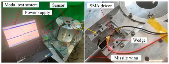 The prototype of the developed clearance eliminator and the built modal test set are shown in Figure 34. The internal SMA driver of the prototype is heated by energizing. The support stiffness of the wing is tested to verify the function of the clearance eliminator and to test the dynamic support stiffness performance after the wing is deployed.