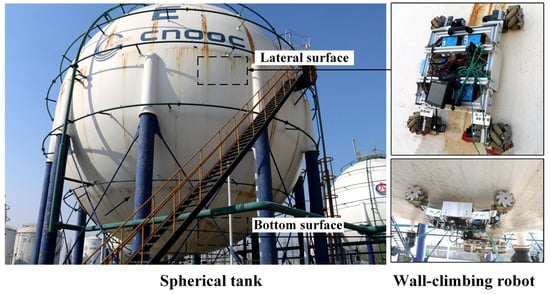 Developed wall-climbing robot on a spherical tank. Note: Spherical tanks put forward higher requirements on wall-climbing robots and the robot must adapt to the curved surfaces to ensure stable adsorption.