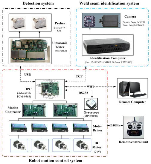 The weld seam identification and tracking system of the inspection robot is a composite system and its main functions include weld seam identification, path calculation, motion control and data transmission. As shown in Figure 3, the robotic system includes the following subsystems: robot motion control system, weld seam identification system, detection system and remote computer. The robot motion control system mainly includes an industrial personal computer (IPC), motion controller, motor drivers, DC motors, a gyroscope and a remote control unit. It realizes the movement function of the robot, position adjustment and remote control. The weld seam identification system is used to identify weld seams and calculate seam path, including an identification computer (GPU RTX 2060) and an industrial camera. The detection system is an additional device of the robot, and the defect detection of weld seams is performed by ultrasonic probes. The remote computer is connected to the robot through a wireless router for data analysis and storage.