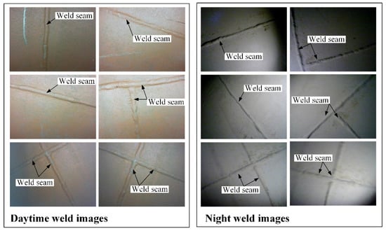 Real-time weld path tracking can make the inspection robot more automatic and intelligent. However, it is difficult to realize the weld seam identification and path line extraction with high-precision. After long-term work, the weld seams on spherical tank surfaces are covered by dirt and rust, which seriously affect identification accuracy. Weld seam images under the daytime and nighttime lighting conditions acquired by the inspection robot are shown in Figure 4. According to distribution characteristics, weld seams on tank surfaces include transverse weld seams, longitudinal weld seams, diagonal weld seams, crossed weld seams, etc. Different weld seam categories increase the difficulty in fitting weld paths. Due to the small distinction between weld seams and the surrounding feature identification by image processing is usually incomplete and it is difficult to extract the seam path information. Some image processing techniques [28], such as edge detection algorithms and digital morphology, have been tested to extract weld seam path lines, but the extraction results are not satisfactory.