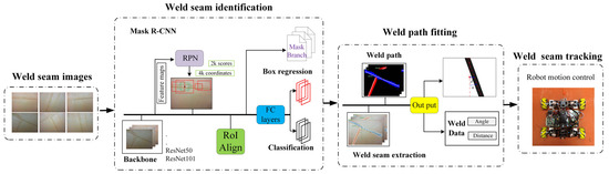 Figure 5 shows the workflow of weld seam identification and tracking, which is divided into four steps. Firstly, the weld images are captured by the camera; secondly, weld seams in images are identified by deep learning networks; thirdly, seam paths are extracted and fitted; finally, the robot is controlled to track weld paths based on path information. The purpose of the deep learning networks we used is to accurately segment weld seams. The ultimate goal is to extract weld seams and output path information.