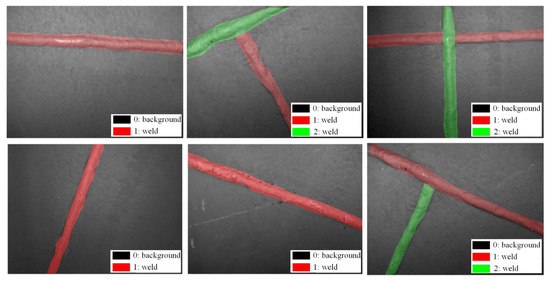 During the training phase of Mask R-CNN, 2281 weld seam images at different angles were collected (more images might have the better effect). The image size was fixed at 320 × 240. In the collected images, 1500 images were used as the training dataset; 500 images were used as the verification set; and 281 images were used as the testing set. These dataset images were labelled and processed in advance. Some data augmentation methods, such as random flip, random crop, color jitter and noise addition, were used to extend the dataset. Image transformations and noise addition were beneficial to avoid overfitting. After data augmentation (24 types), the number of weld seam images in the training set, validation set and test set were 37,500, 12,500 and 7025, respectively. Figure 6 visualizes results of the weld seam dataset. Regarding the label number, 1 (or 2) represents weld seams and 0 represents the background.